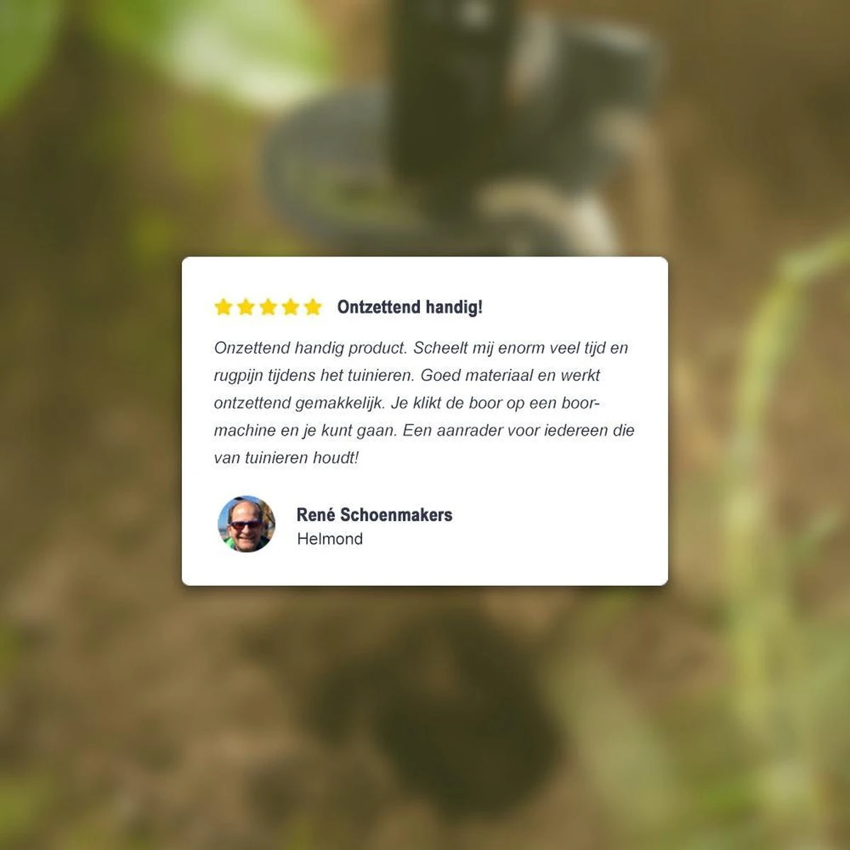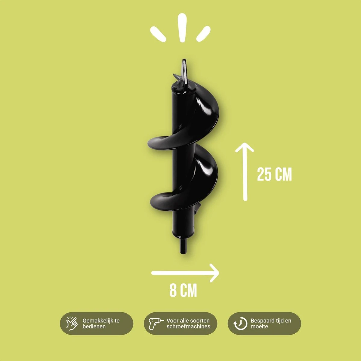 Plaats de grondboor in een boor of schroefmachine en je hebt binnen enkele seconden een mooi rond gat waar je in kunt planten. Binnen no-time evenredige gaten en geen last meer van rugpijn door het handmatig scheppen.
