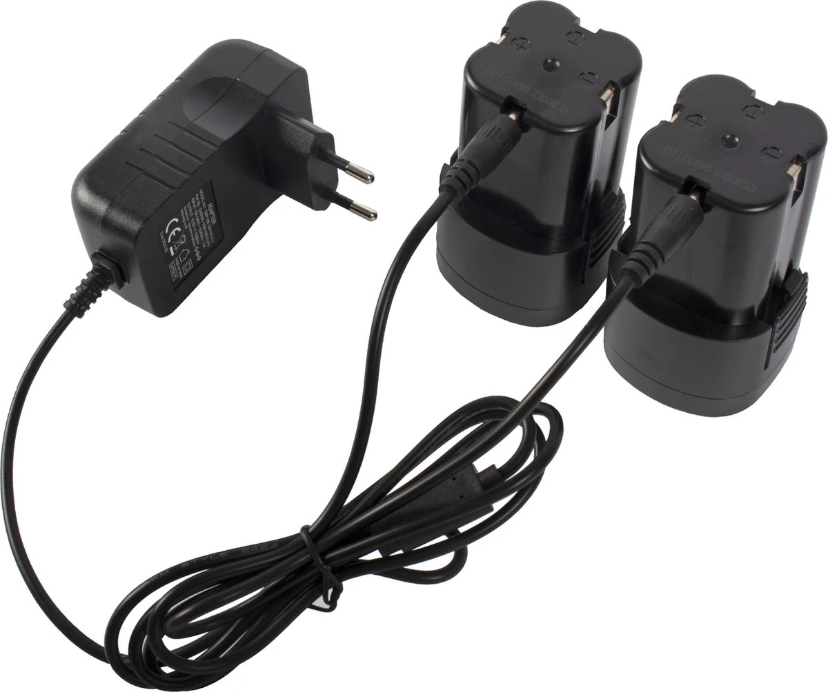- 1x Oplaadsnoeir (waar beide accu’s gelijktijdig aan kunnen)